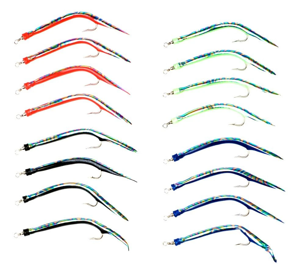 Diese Gummi-Makks haben zusätzlich eine glänzende Oberfläche auf der Oberseite. Verfügbar sind diese in den üblichen Größen 6/0 – 12/0 in vier verschiedenen Farben. Mit diesen Gummi-Makks bauen Sie sich Ihre eigenen fängigen Vorfächer oder verbessern Ihre Pilker.