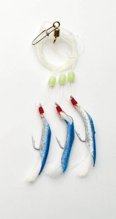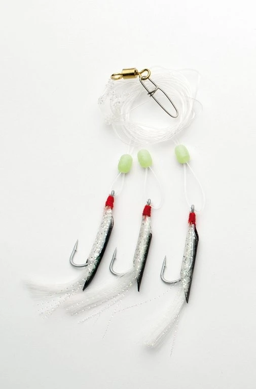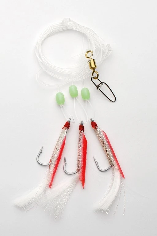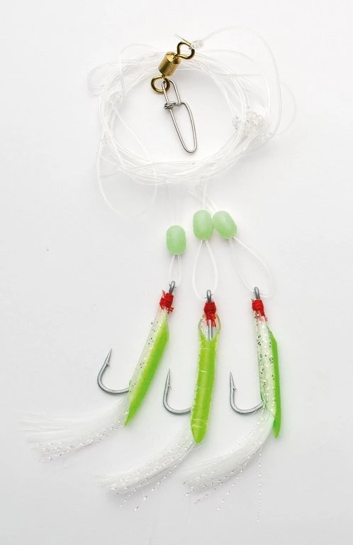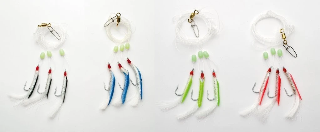 Dieses starke System besteht aus drei Haken der Größe 5/0, die mir Gummischlauch und Tinsel verziert sind. Es stehen 4 verschiedene Farben zur Verfügung. Verwendet wird eine 0,80mm starke monofile Schnur. Das Rig ist 1,50m lang und die Seitenarme 10cm.