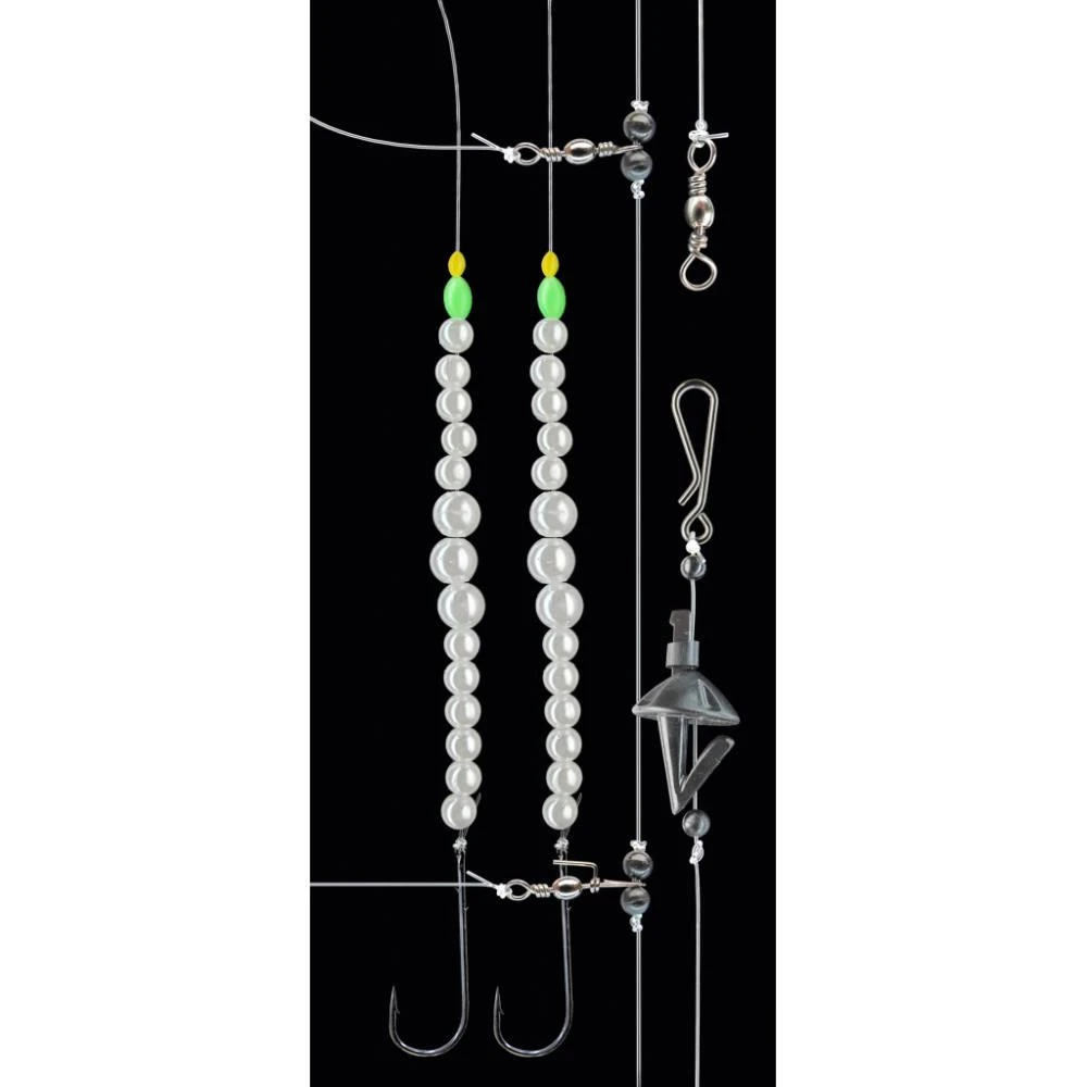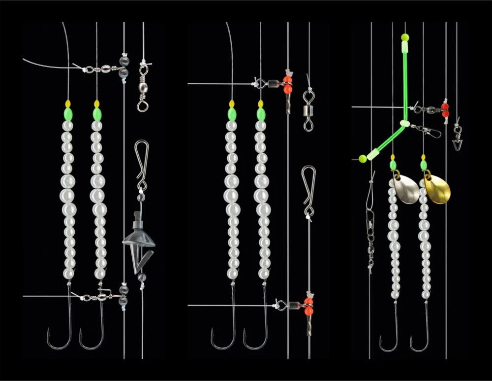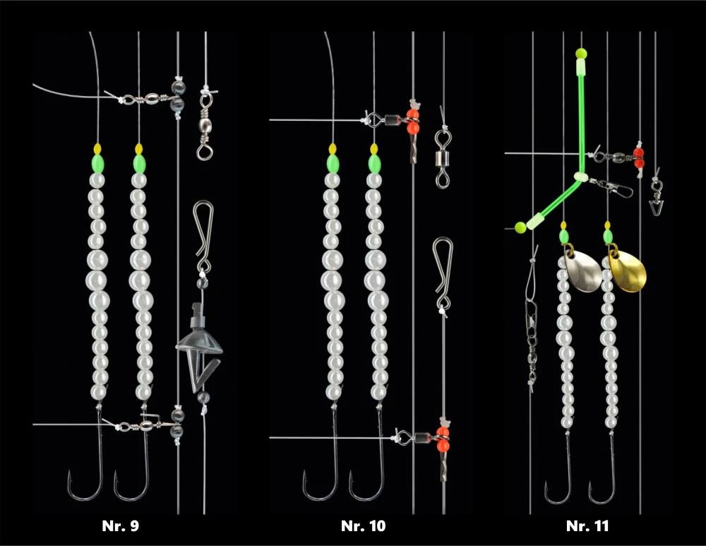 Diese Brandungsvorfächer / Bootsvorfächer sind mit vielen Perlmuttperlen (sehr glitzernd) ausgestattet. Die Hauptschnur hat eine Stärke von 0,60mm und die Mundschnur 0,50mm. Die Haken haben eine Größe von 2 (Nr. 10) bzw. 1 (Nr. 9 und 11).
