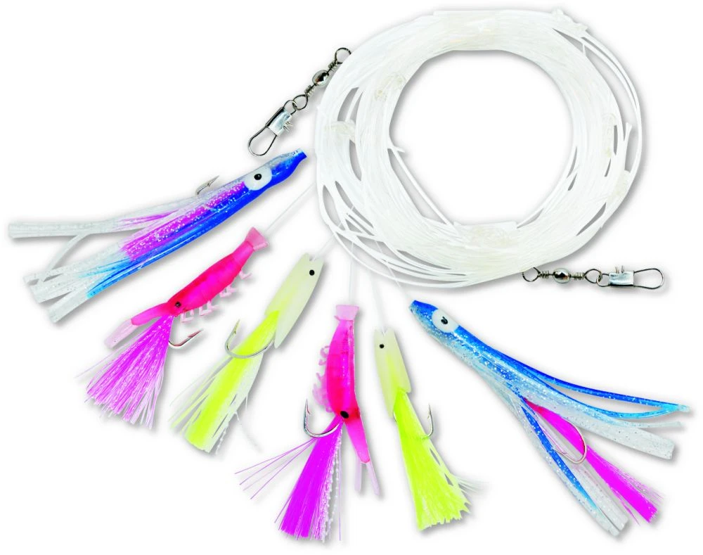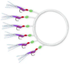 Das Vorfach besitzt sechs verschiedene und farbige Beifänger, die an den sechs Haken der Größe 2 montiert sind.